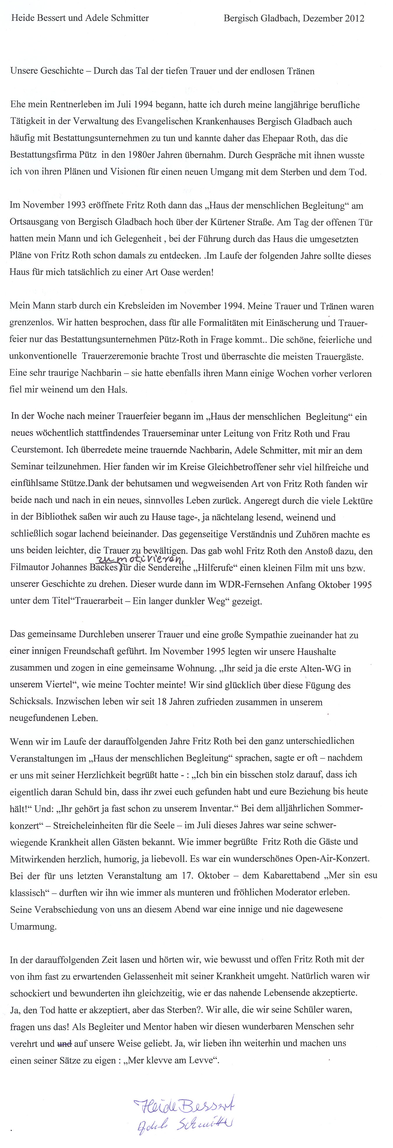 Ich bekam Respekt vor dem Ernst, mit dem sich Fritz Roth seiner neuen Aufgabe in der unmittelbaren Begegnung mit Sterben, Tod und Trauer persönlich aussetzte. Er hatte ja nicht den beruflichen Ausgleich eines Pfarrers, glücklichen Menschen vor der Eheschließung oder bei der Taufe und Konfirmation ihrer Kinder zu begegnen.